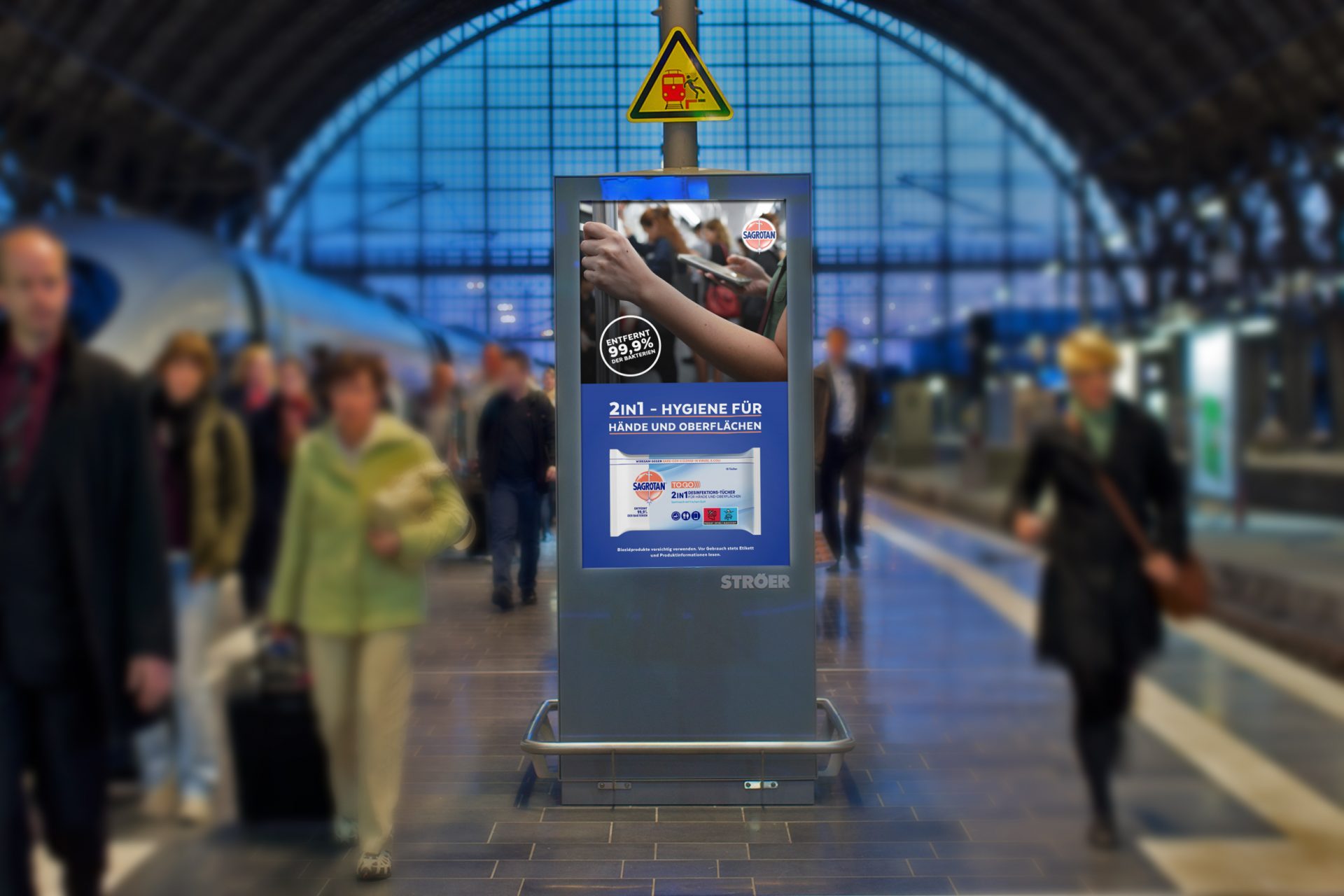 Um dieser Herausforderung gerecht zu werden, setzte Reckitt für die Marke Sagrotan auf eine gezielte Digital-Out-of-Home-Kampagne (DOOH) in stark frequentierten Verkehrsknotenpunkten: