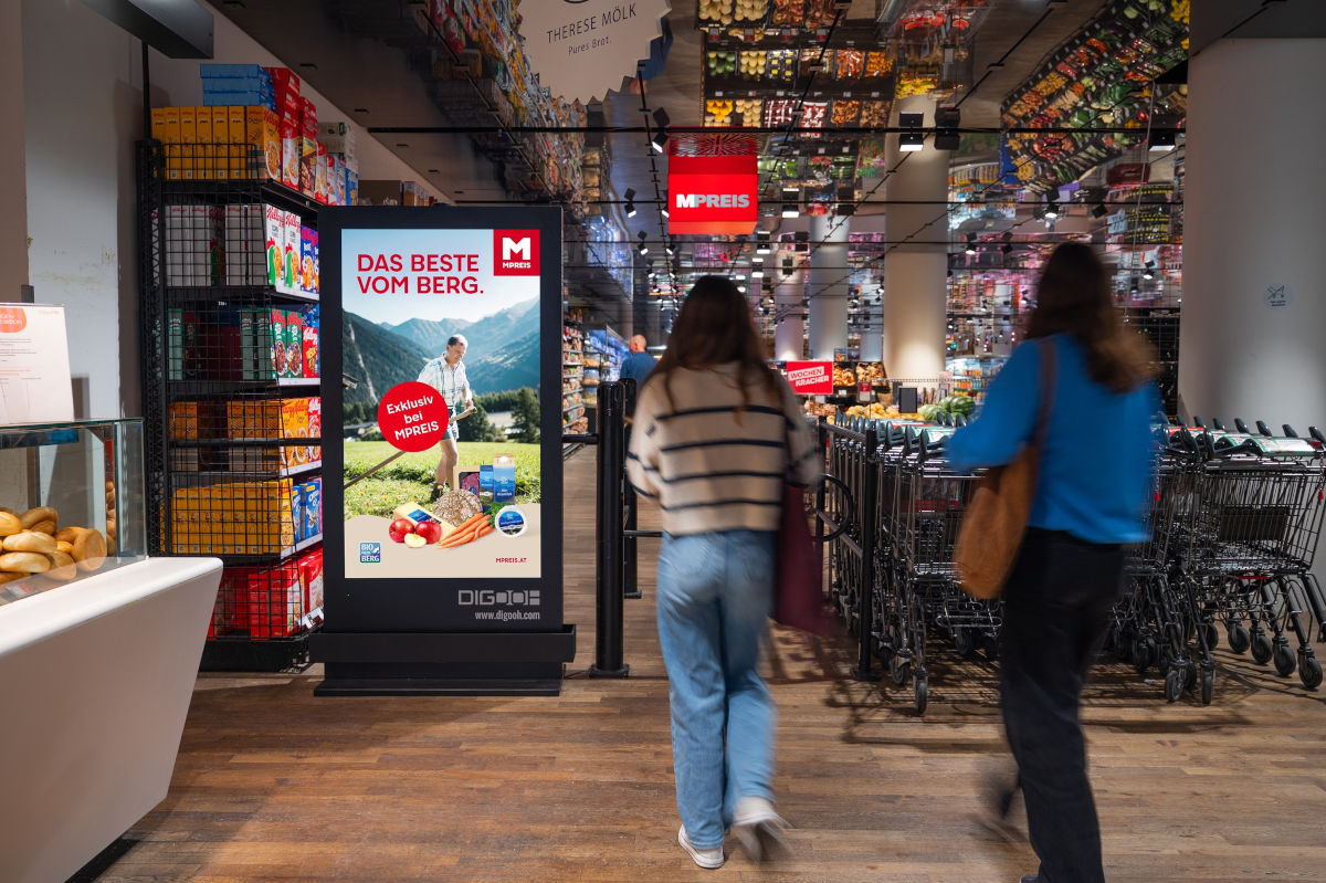 MPREIS ist mit rund 240 Filialen in Österreich vertreten und kommt mit etwa 5.500 Mitarbeitern auf einen Jahresumsatz von mehr als einer Milliarde Euro. Als erster österreichischer Lebensmitteleinzelhändler setzt der Händler auf die DCLP-Technologie der DIGOOH. Die großformatigen Displays im Hochformat 9:16 mit 4K-Auflösung und einer Bildschirmdiagonalen von 65 Zoll sollen eine zeitgemäße digitale Angebotskommunikation am Point of Sale ermöglichen.