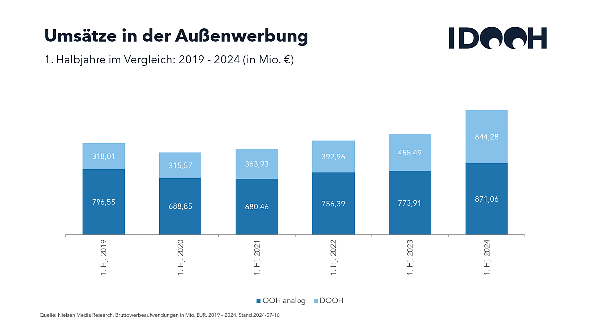 Auch Digital Out of Home (DOOH) befindet sich weiterhin auf Wachstumskurs: Laut Nielsen Werbetrend legt das Segment der digitalen Screens im öffentlichen Raum ein überaus erfreuliches erstes Halbjahr 2024 hin. Die Halbjahresbilanz kann sich sehen lassen: Von Januar bis Juni erwirtschaftet DOOH einen Brutto-Umsatz von 644,3 Mio. Euro – das sind 41,4 Prozent mehr (+188,79 Mio. Euro) als im Vorjahreszeitraum. Der Gesamtwerbemarkt legt dagegen mit einem Brutto-Umsatz von 16,54 Mrd. Euro um 1 Prozent zu (Vorjahreszeitraum: 16,37 Mrd. Euro).