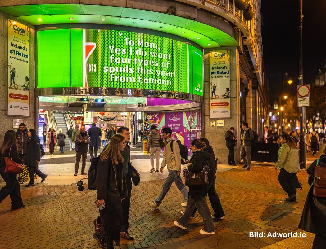 Auch in Irland weihnachtet es langsam sehr – Heineken startet in die Saison mit einer smarten DOOH-Aktivierung im Einkaufszentrum St Stephen’s Green in Dublin. Dort lädt die Brauerei die Besucher ein, persönliche Weihnachtsbotschaften zu erstellen, die dann live auf eine überdimensionale, festlich dekorierte Magnum-Heineken-Flasche projiziert werden. Beteiligt sind die Partner Talon, Dentsu, Thinkhouse und Ladbible.