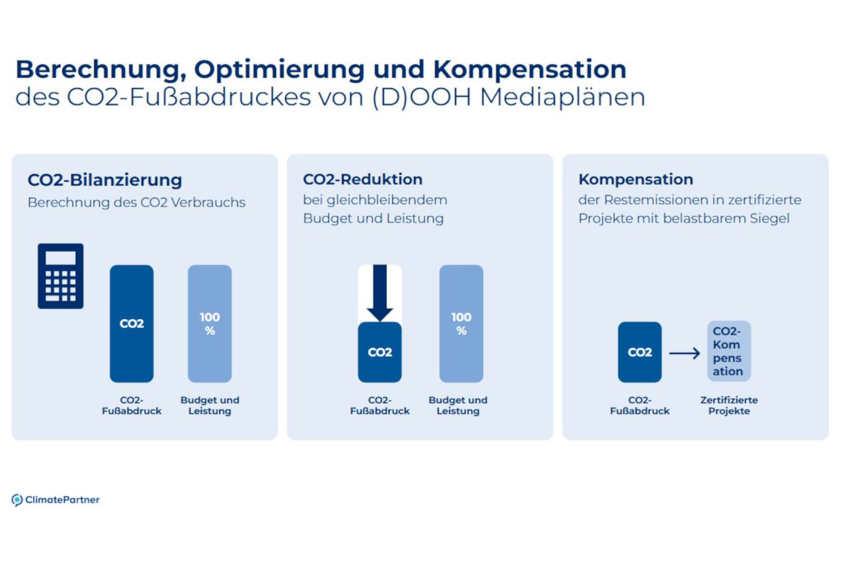 Für den Eco Check arbeitet It Works mit ClimatePartner zusammen. Das Unternehmen berücksichtigt bei der Ermittlung von CO2-Emissionen beispielsweise die Papierproduktion, den Druck der Motive, die Anbringung inklusive Logistik sowie den Stromverbrauch bei entsprechender Beleuchtung, Servern und Netzen. Kompensiert wird beispielsweise in die Aufwertung von Agrarflächen, Waldschutzprojekte oder auch die Renaturierung von Mooren.