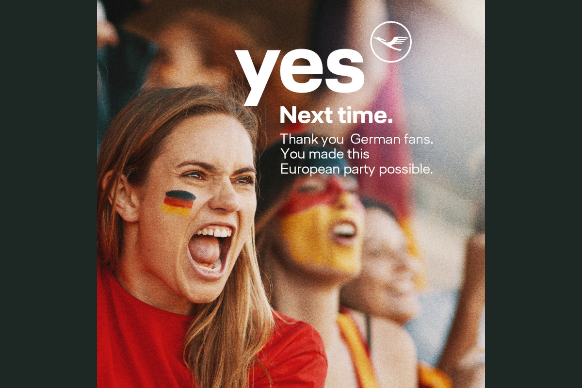 Ab dieser Woche sind Dankesbotschaften an die 24 Teilnehmernationen als DOOH-Motive in den Hauptstädten oder als Posts auf den jeweiligen Lufthansa Social-Media-Kanälen zu sehen. Für jedes Land gibt es ein individuelles Motiv und eine individuelle Botschaft, in denen auf die Besonderheiten der Fans eingegangen wird. Die Kampagne honoriert den sensationellen Gruppengewinn der Österreicher, die Niederländer:innen, die uns alle “naar links, naar rechts” springen ließen, den Spirit der Französ:innen, die die Straßen in die Champs-Elysées verwandelt haben, und sie hat tröstende Worte für die deutschen Fans: “Yes. Next Time.”