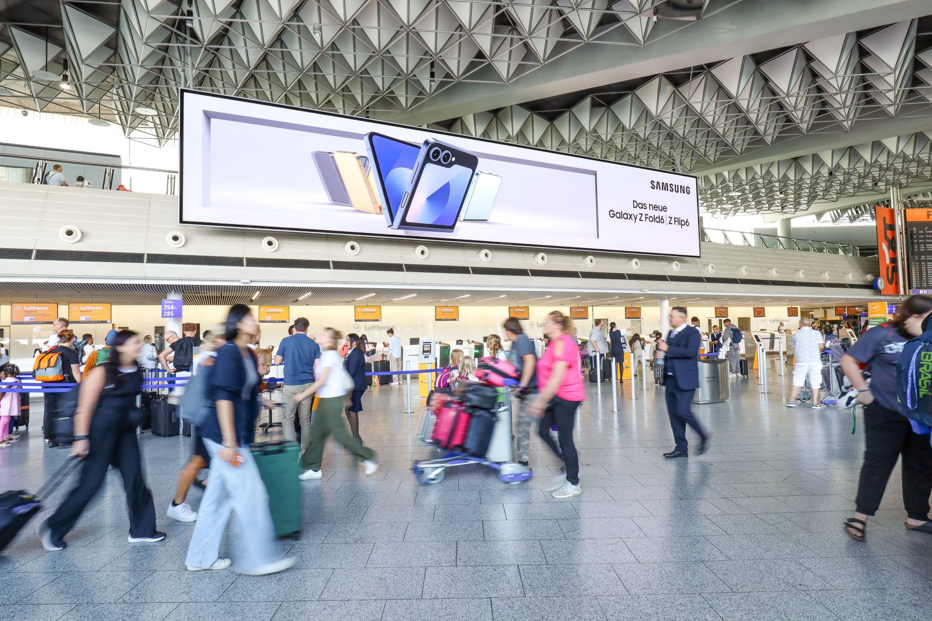 Auf den Screens sind derzeit die kürzlich vorgestellten faltbaren Smartphones Galaxy Z Fold6 und Galaxy Z Flip6 sowie die neuen Wearables Galaxy Watch Ultra, Galaxy Ring und Galaxy Buds3 Pro von Samsung zu sehen. „Wir wollen für unsere Kampagnen die spektakulärsten Flächen an den wichtigsten Werbe-Hotspots in Deutschland buchen“, so Mario Winter, Vice President Marketing bei Samsung Electronics Deutschland. Er setzt auf das „internationale, kaufkräftige Publikum an diesem Standort“ – rund 65 Millionen internationale Passagiere fliegen jährlich vom Frankfurter Flughafen ab.