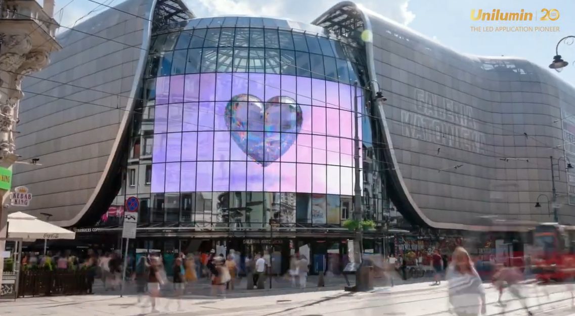 Die beiden Unternehmen Unilumin und Screen Networlk haben in Polen ein neues, 153 Quadratmeter großes, LED-Display in Betrieb genommen. Das halbtransparente Display hängt in den Fenstern über dem Eingang eines großen Einkaufszentrums in Katowice, Polen.