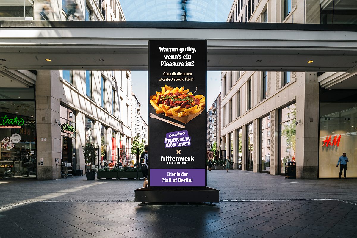 Wir haben zusammen mit Frittenwerk ein neues Highlight gelauncht – die planted.steak Fries – eine Kombination aus unserem pflanzlichen planted.steak und goldenen Hausfritten. Diesen Launch wollten wir so groß wie möglich aufziehen und haben dafür eine 360-Grad-Kampagne entwickelt, bei der digitale Außenwerbung ein Teil des Media-Mix war. Es ging uns darum, mit diesem reichweitenstarken Medium eine möglichst große Sichtbarkeit zu erreichen. Die Kampagne lief auf 95 Werbeflächen an stark frequentierten Standorten, bevorzugt in der Nähe der Frittenwerk-Standorte. Also genau da, wo die hungrigen Passanten unterwegs waren.