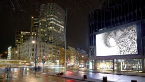 Das DEMO-Festival von Studio Dumbar und Dept geht noch einen Schritt weiter: Was in Amsterdam mit Bildschirmen am Hauptbahnhof begann, wurde zu einer weltweiten Aktion, bei der 24 Stunden lang Motion Design-Installationen von mehr als 350 Designerinnen und Designern auf 250 Screens an Bahnhöfen, öffentlichen Plätzen, Gebäuden und Einkaufszentren gezeigt werden. Und zwar weltweit von Amsterdam bis Los Angeles, auch Hamburg und Düsseldorf nahmen teil. Jeden Tag um eine bestimmte Uhrzeit bringt Circa Art, eine Kulturplattform aus London, außerdem digitale Kunst auf große Screens am Picadilly Circus, in Berlin, Seoul und anderen Städten. Das tägliche Programm unterbricht für drei Minuten die laufende Werbung, dort waren bereits Werke von Ai WeiWei oder Olafur Eliasson zu sehen.