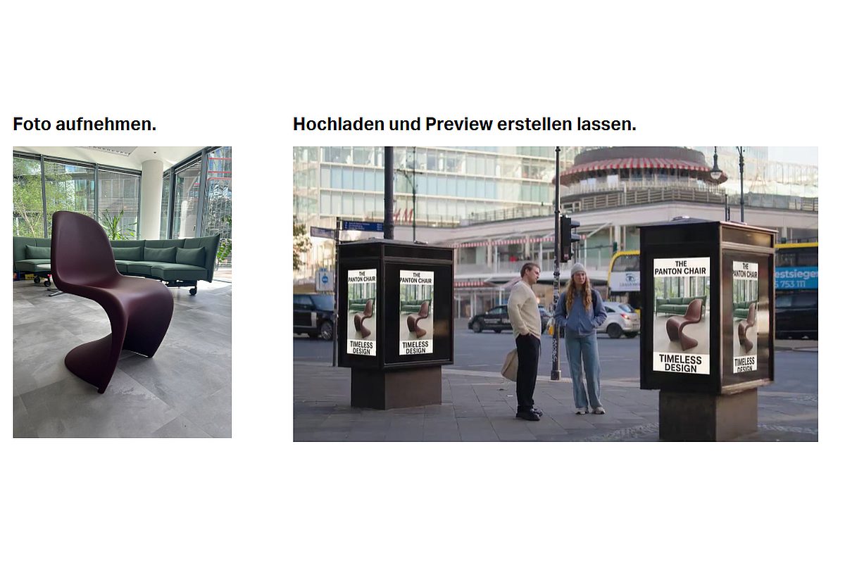 Das Tool ermöglicht eine realitätsnahe Vorschau der Werbemittel. Wenn Nutzer:innen ein Bild oder Video hochladen, generiert das Tool mithilfe von KI ein Creative. Anschließend visualisiert das Tool die Kampagne, so wie sie auf den Displays des HYGH-Netzwerks aussehen würde – zum Beispiel im City Network oder dem Elevator Network. Bei Bedarf lassen sich aus Bildern auch Videos erstellen. So lassen sich Kampagnen im Vorfeld testen und präsentieren.